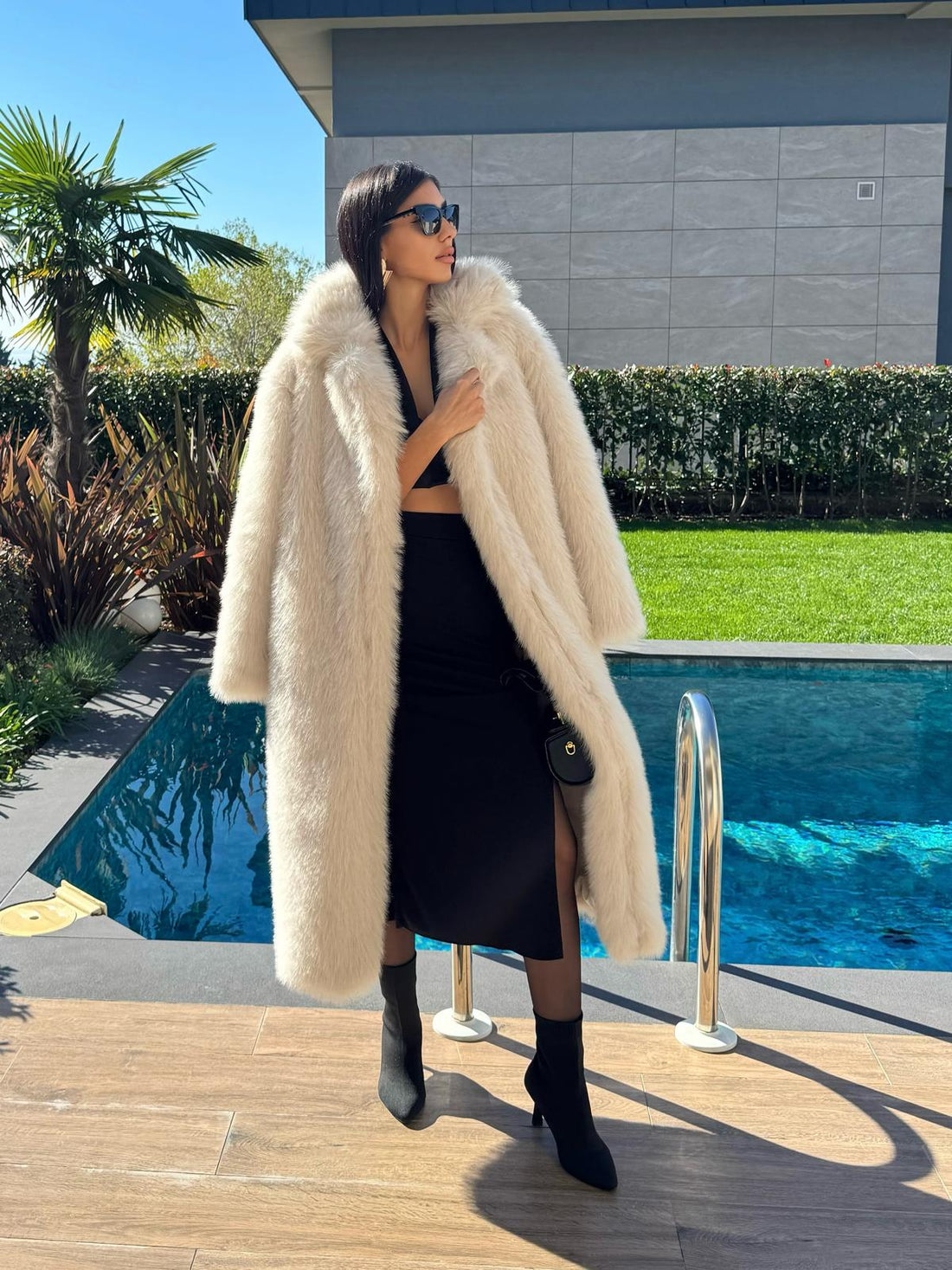 Ekru Astarlı Kemerli Peluş Tüylü Ceket
