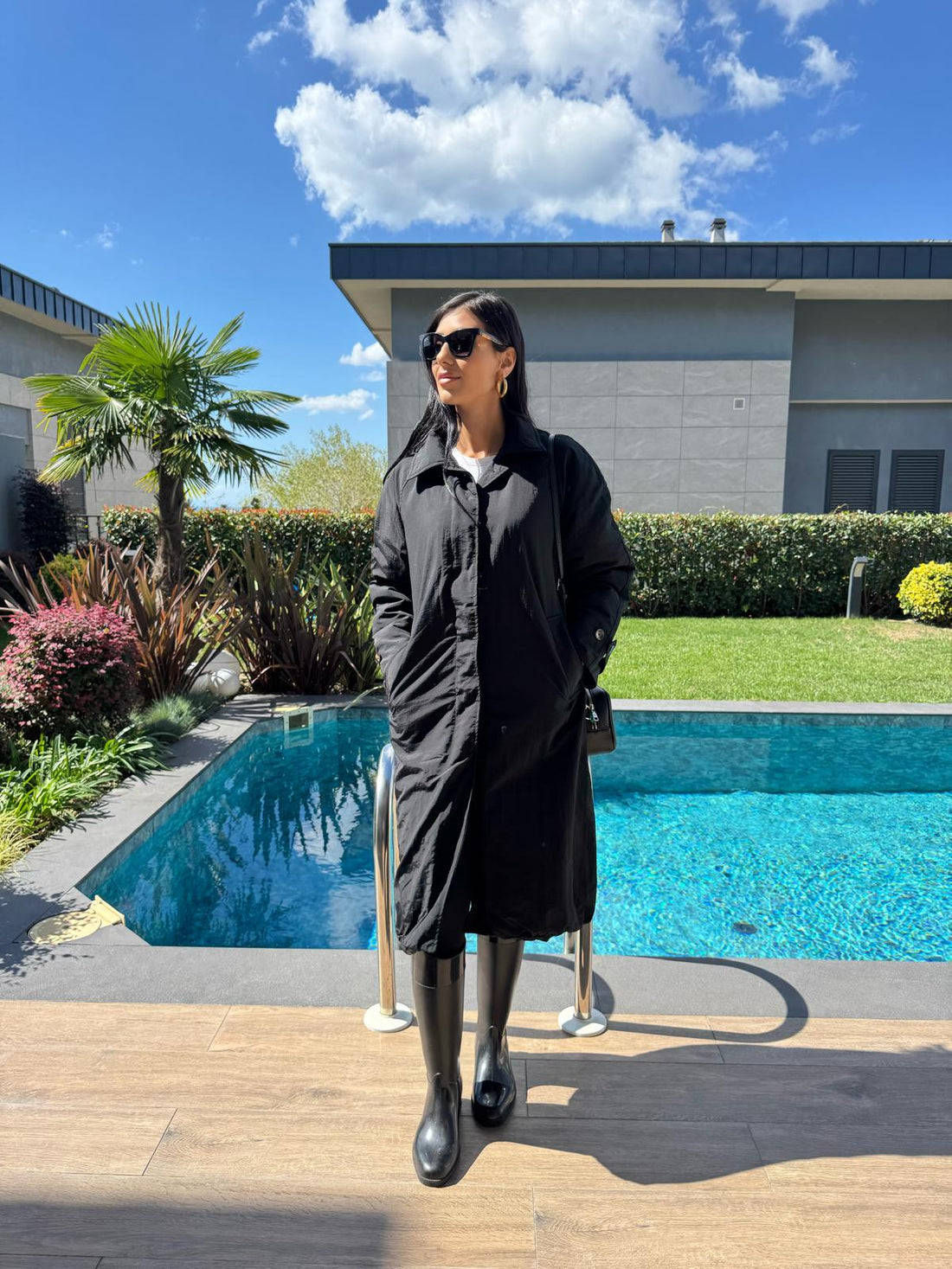 Siyah Uzun İçi Dolgulu Yağmurluk Mont