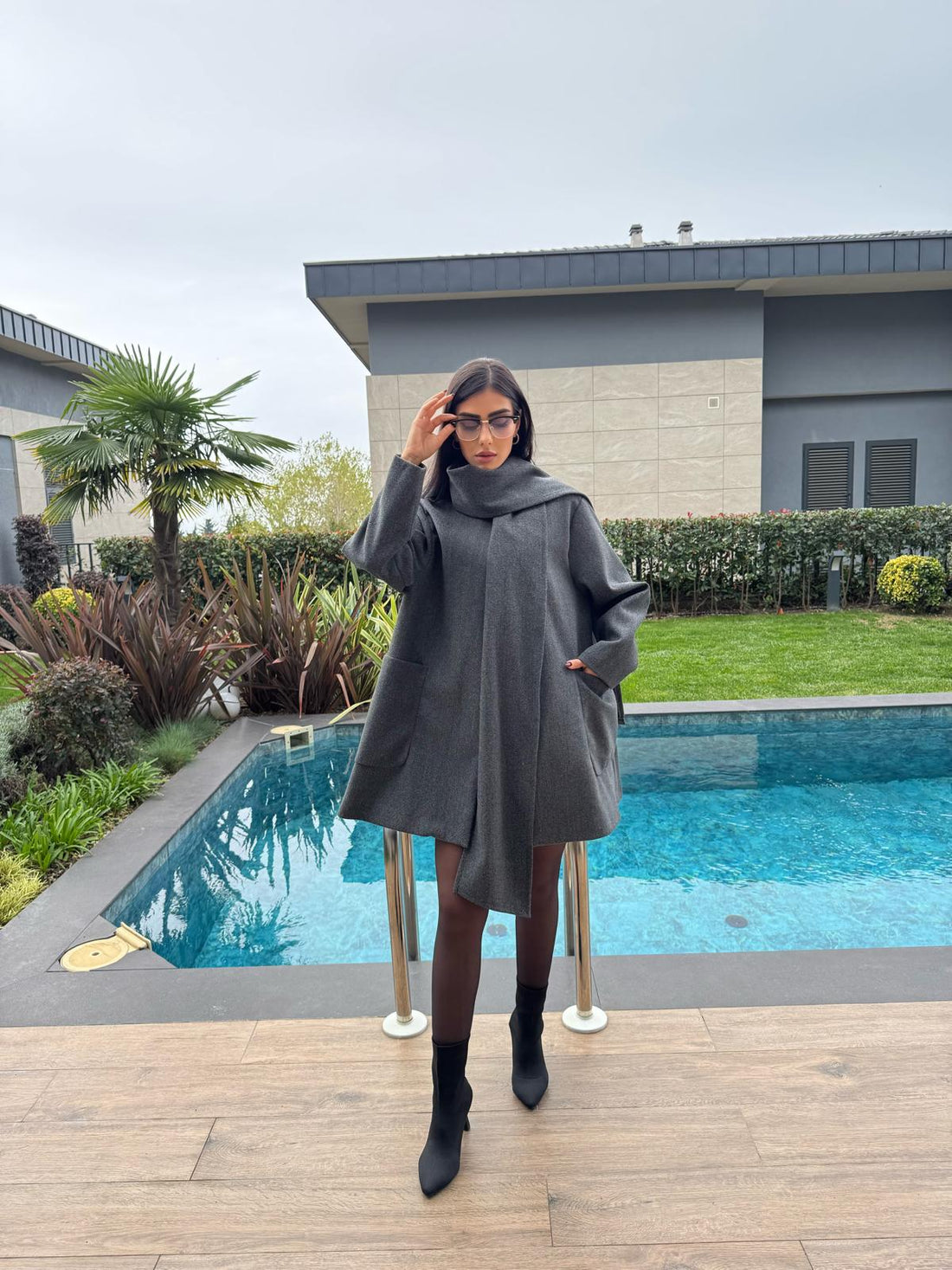 Şal Detaylı Premium Kalite Antrasit Kaşe Kaban