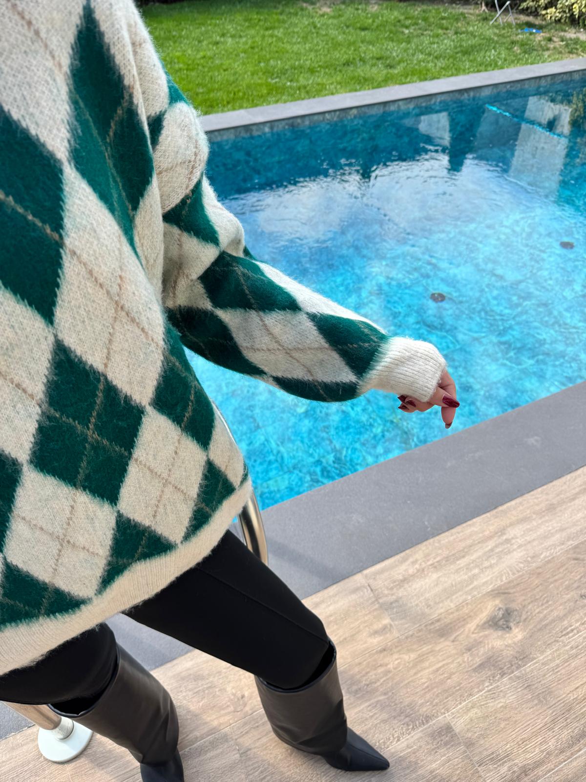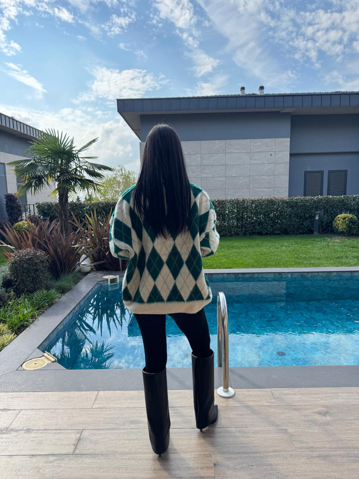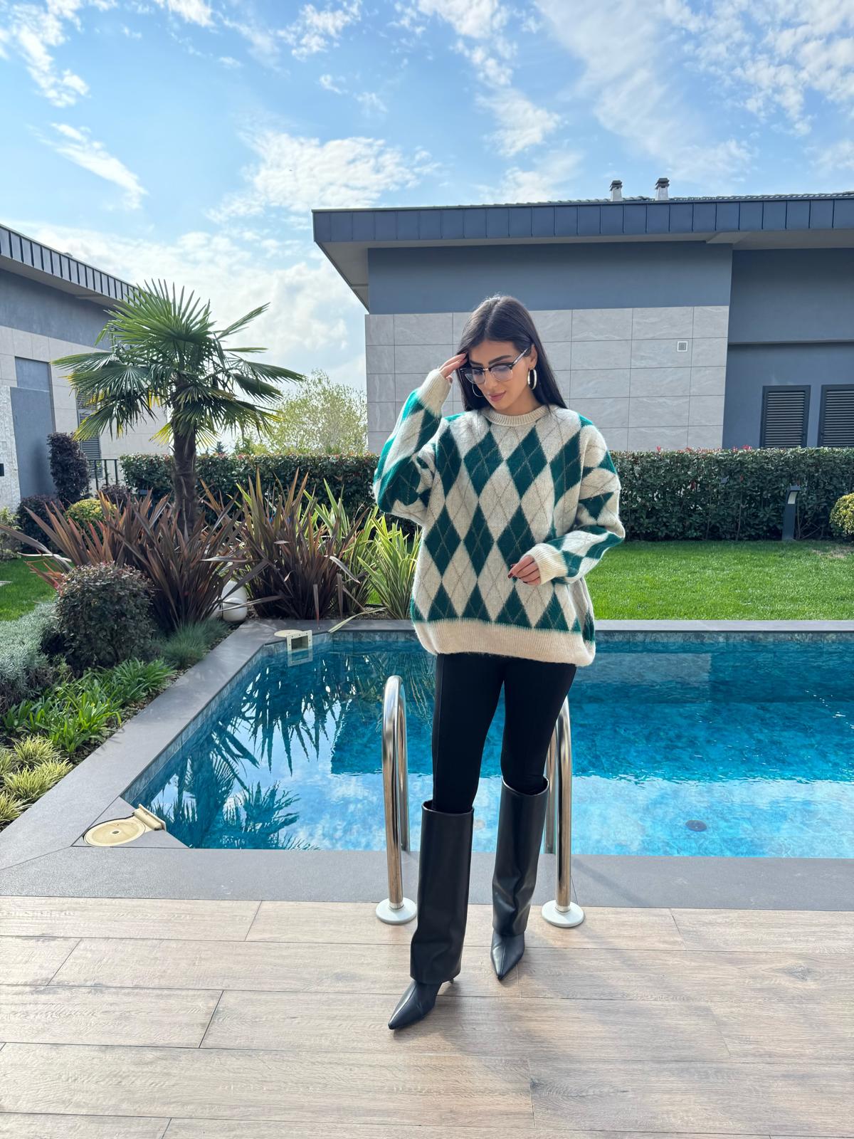 Ekru Yeşil Baklava Desenli Kazak