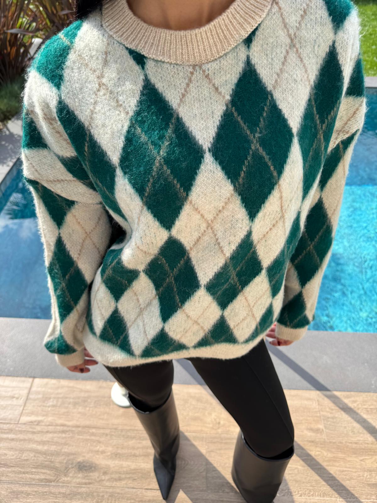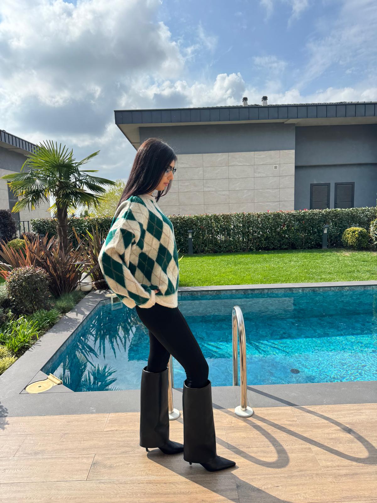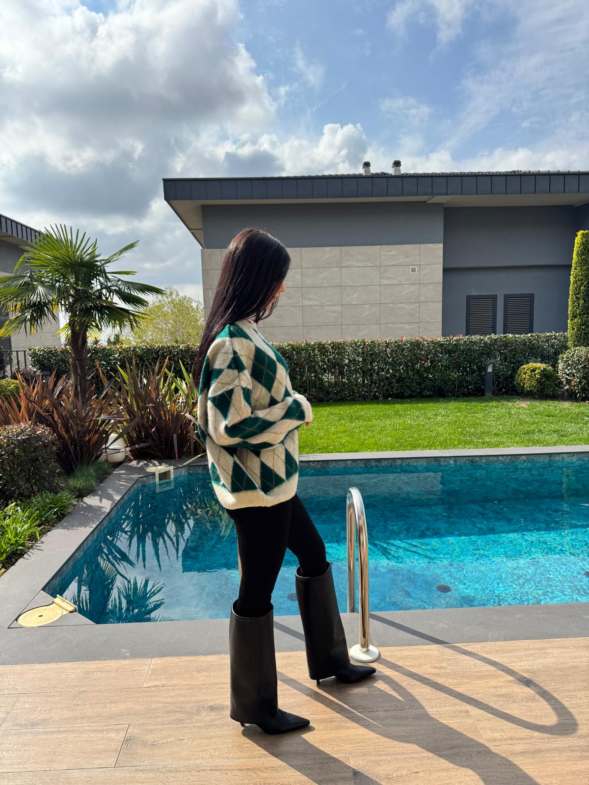 Ekru Yeşil Baklava Desenli Kazak