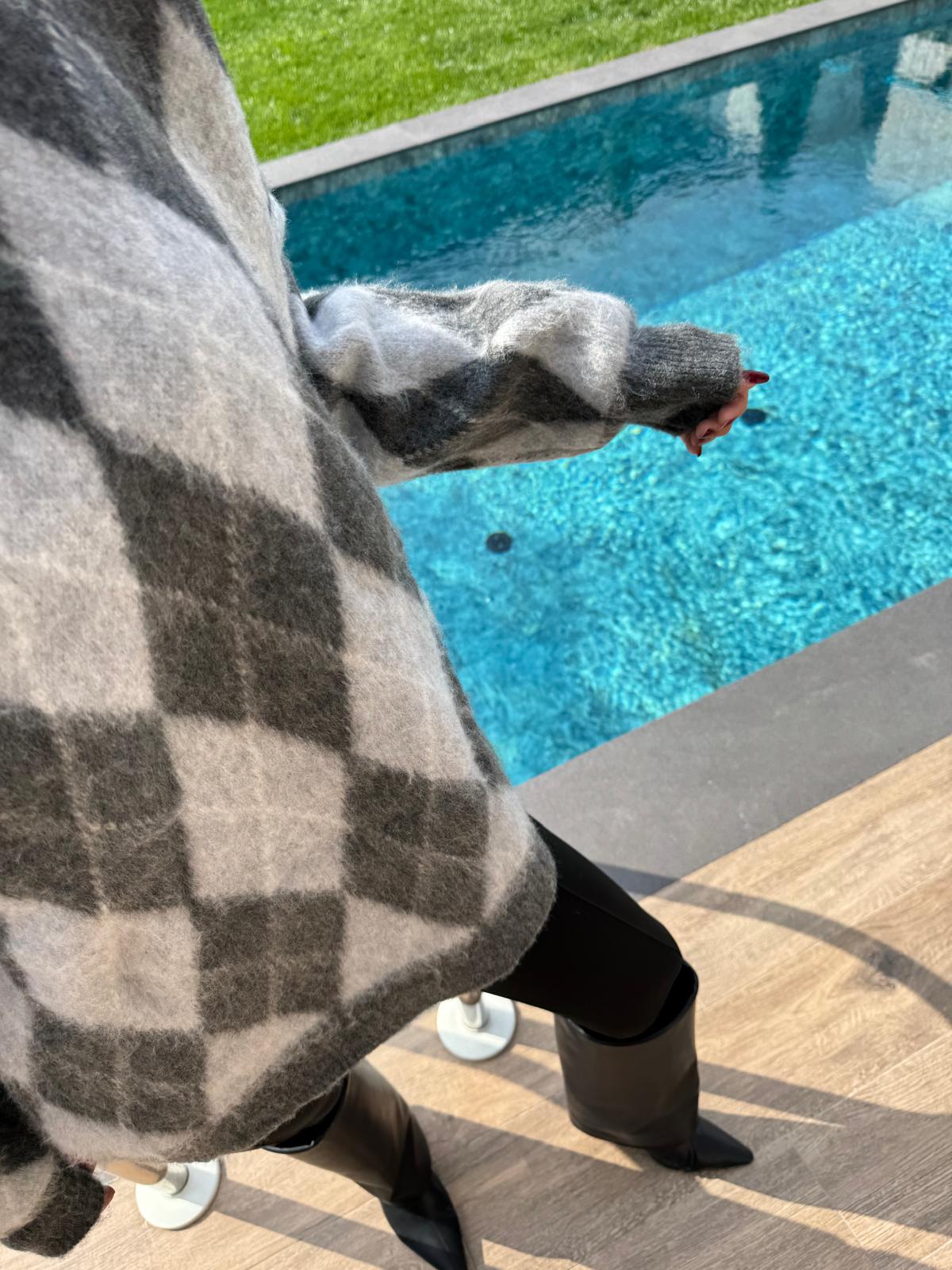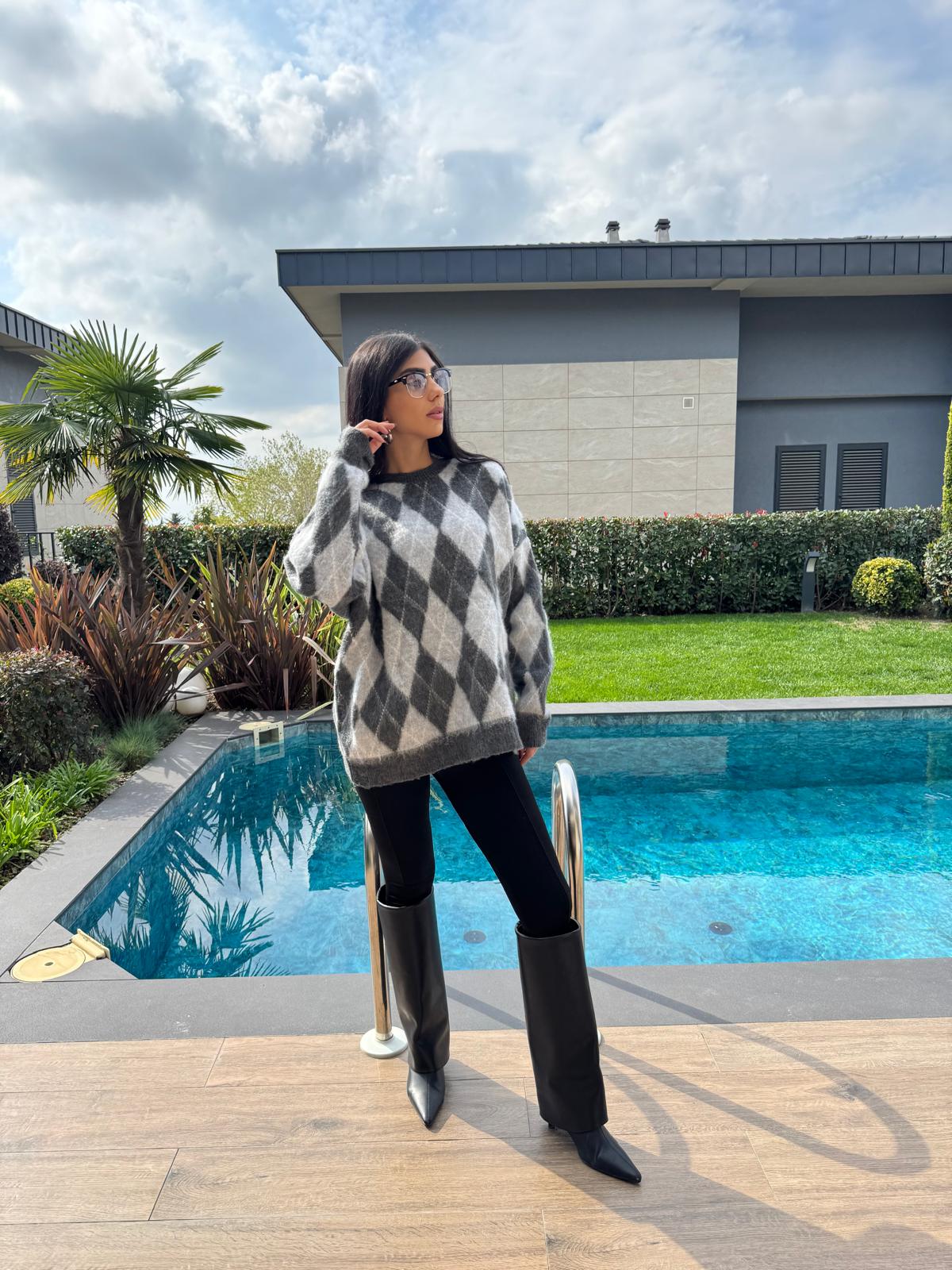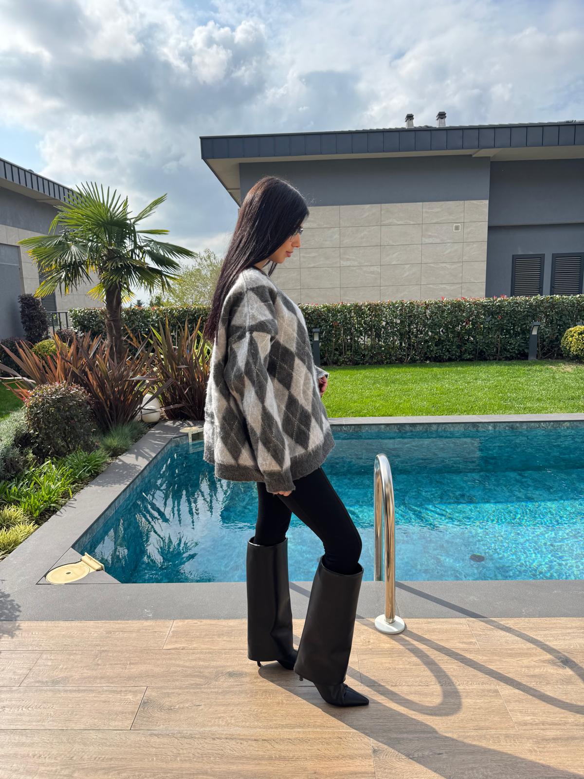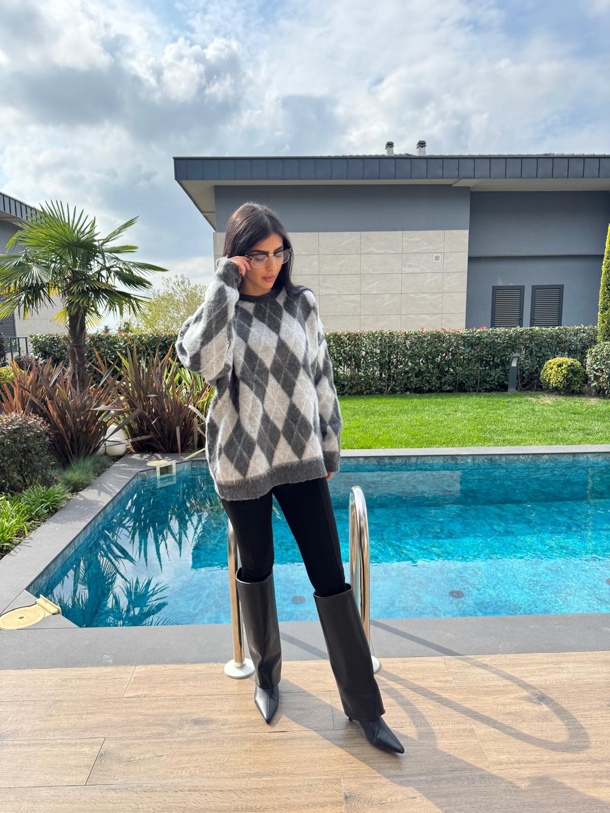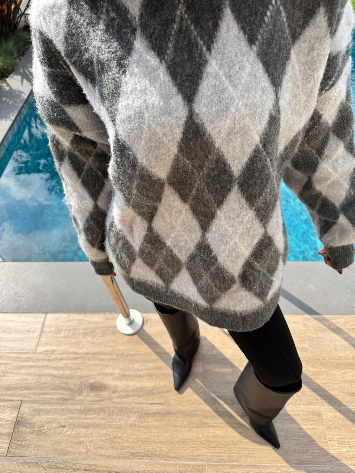 Gri Baklava Desenli Kazak