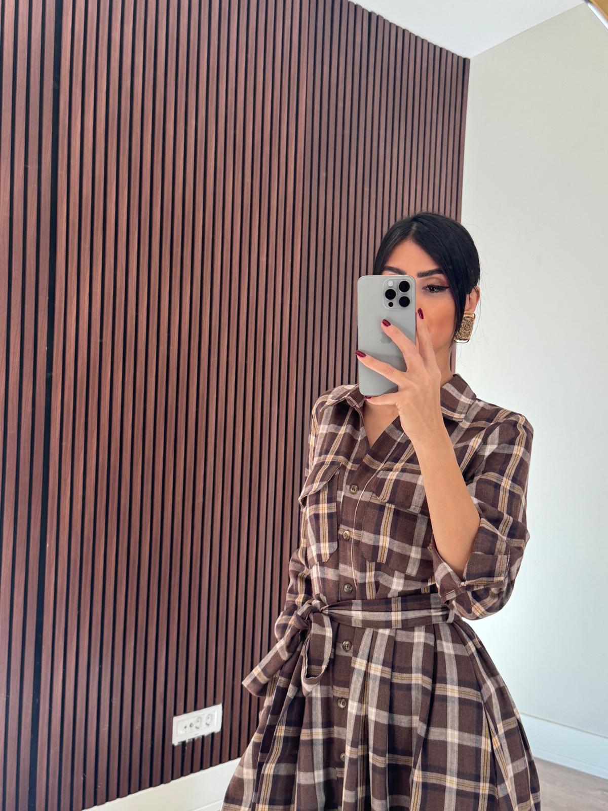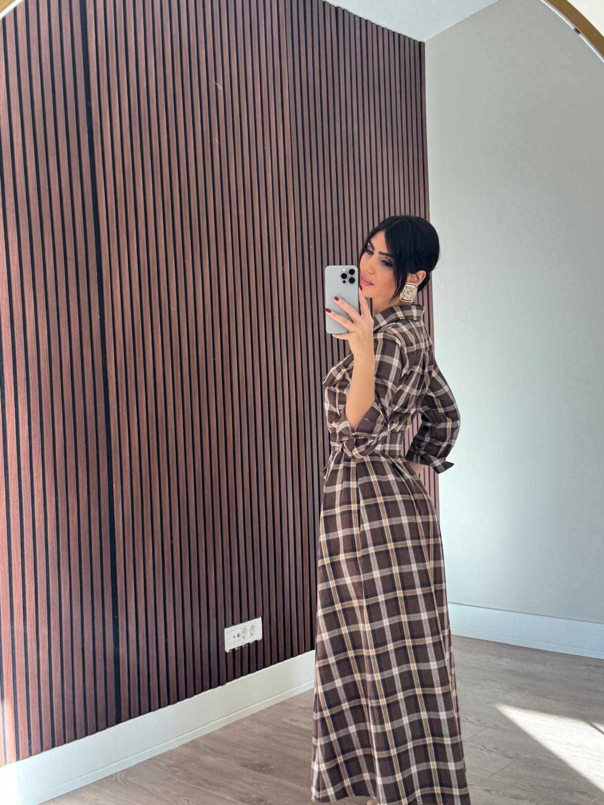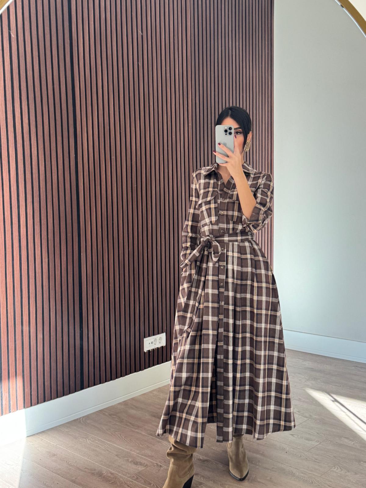 Kahve belden oturtmalı boydan düğmeli ekose desenli gömlek elbise