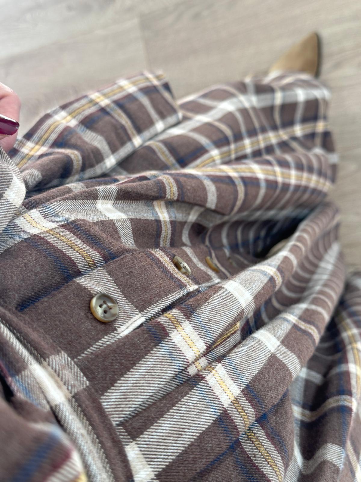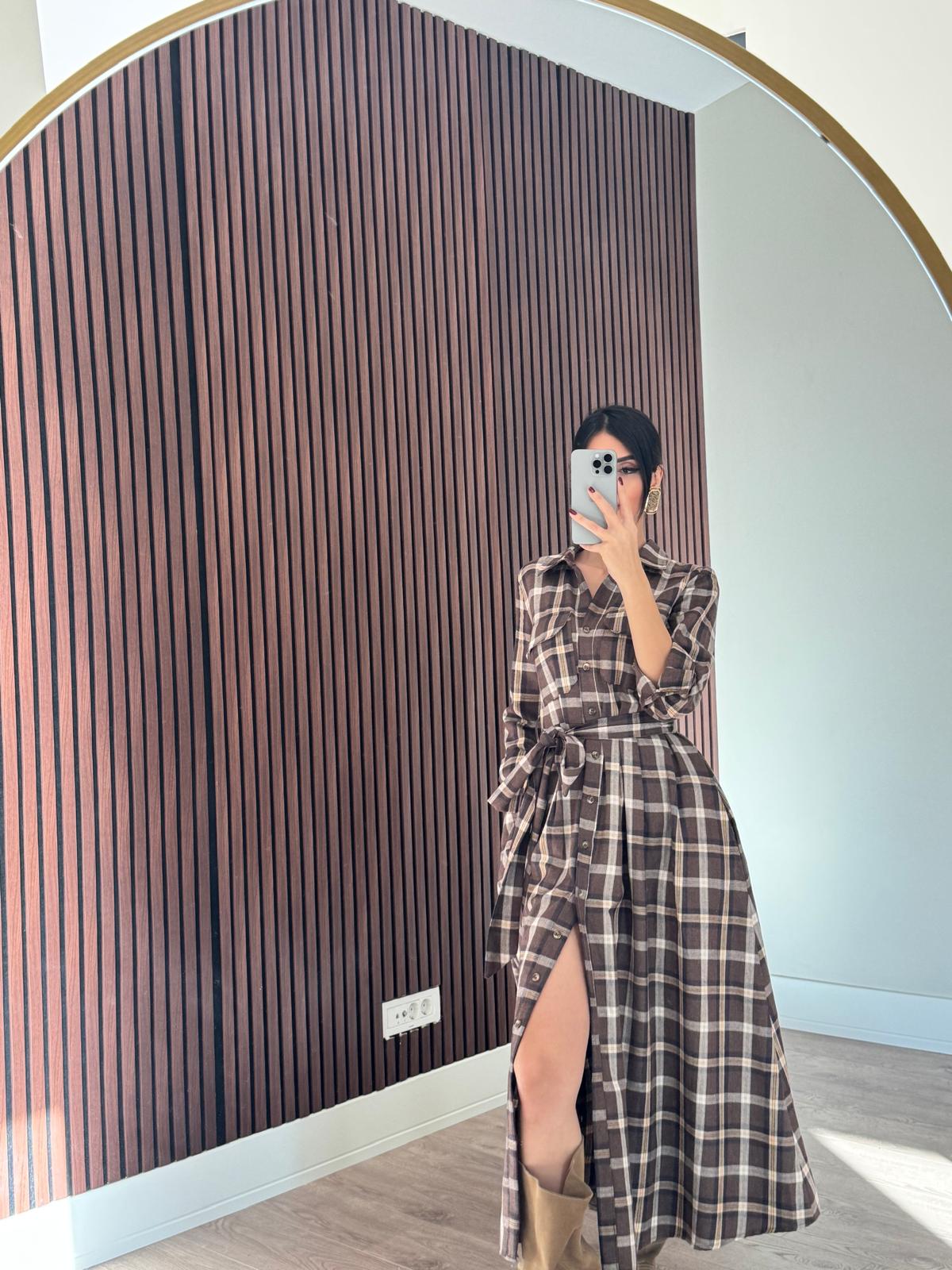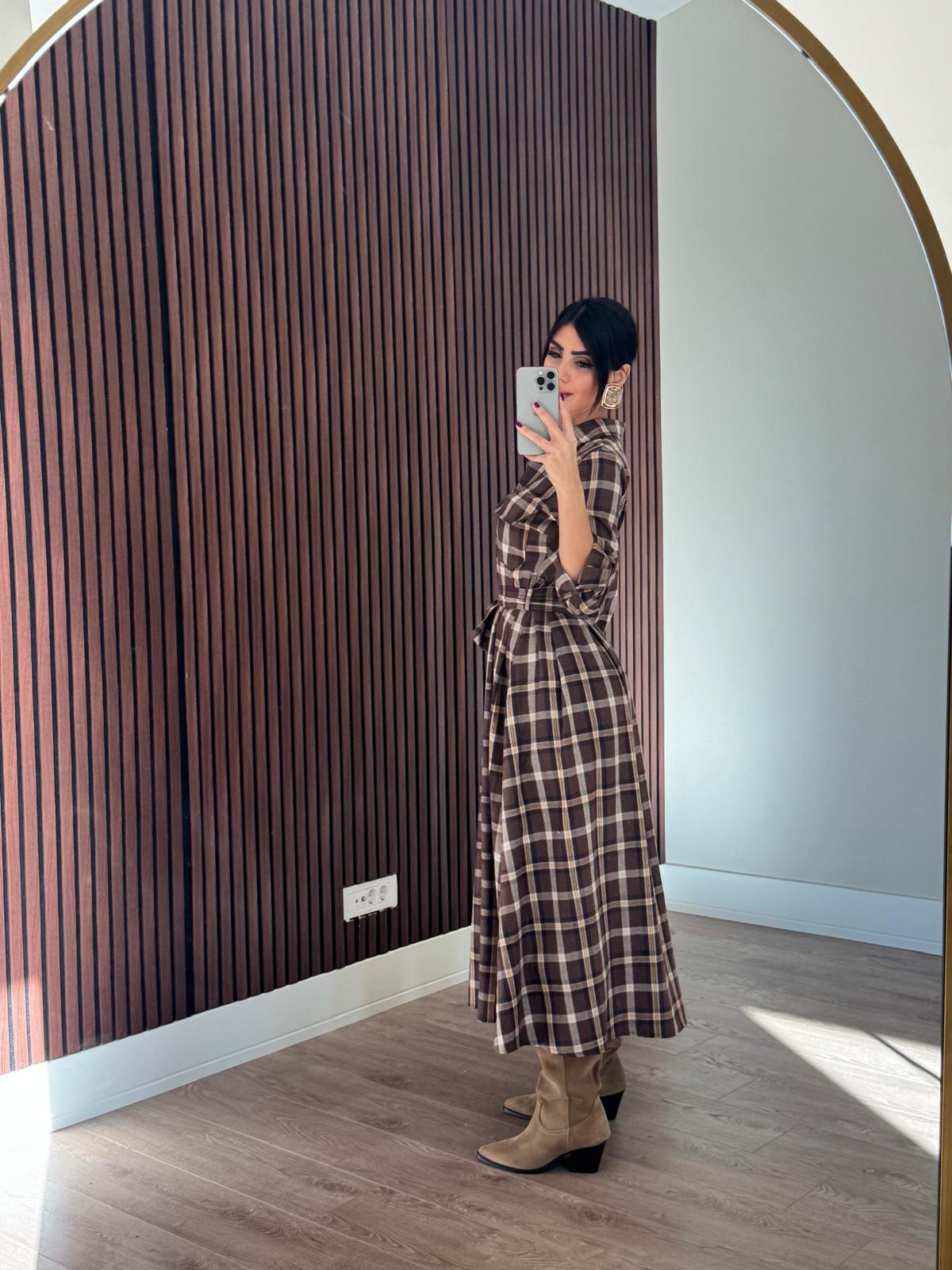 Kahve belden oturtmalı boydan düğmeli ekose desenli gömlek elbise