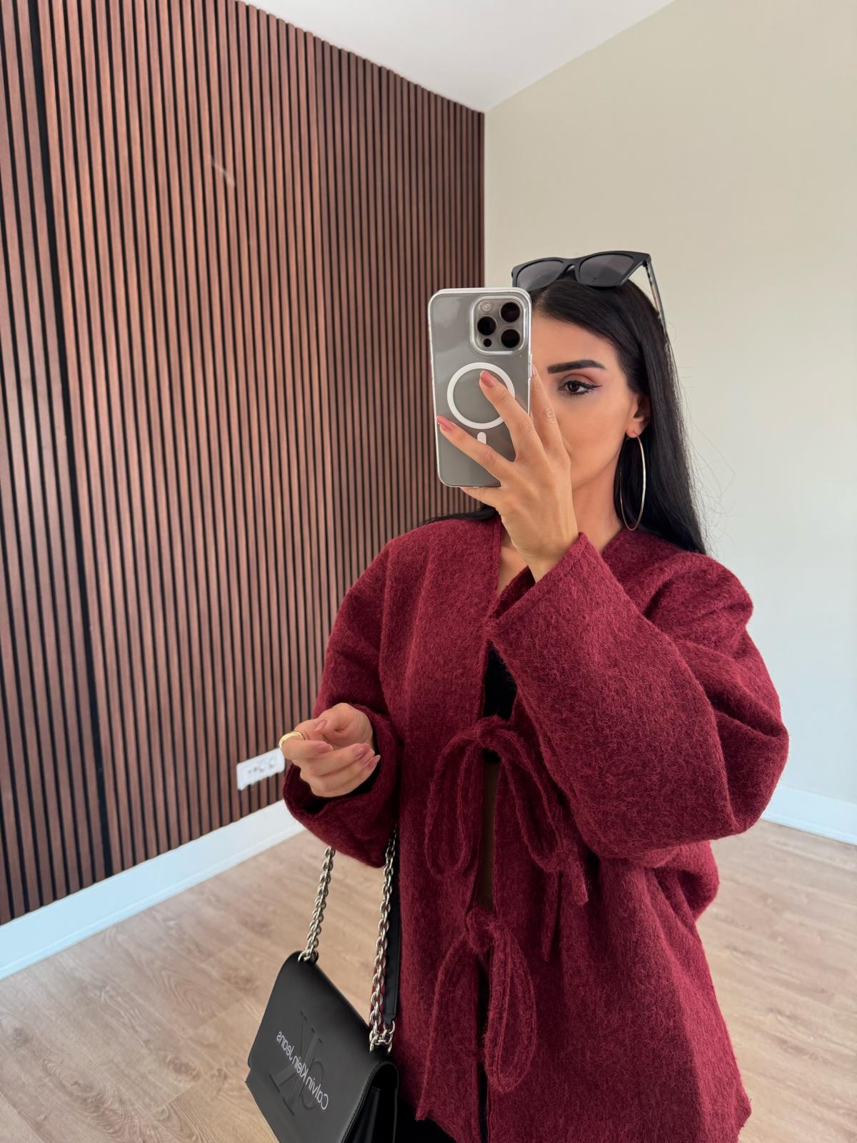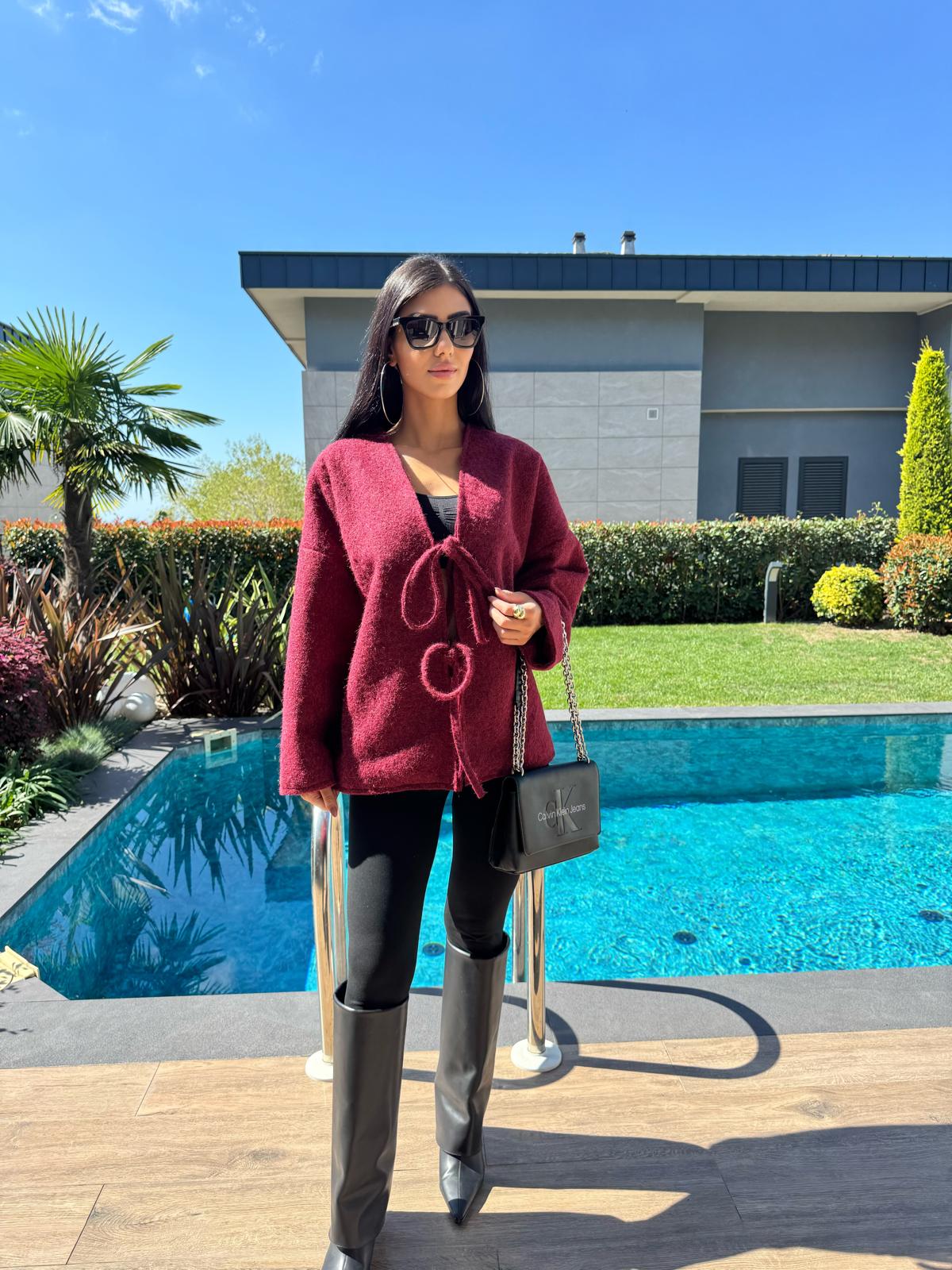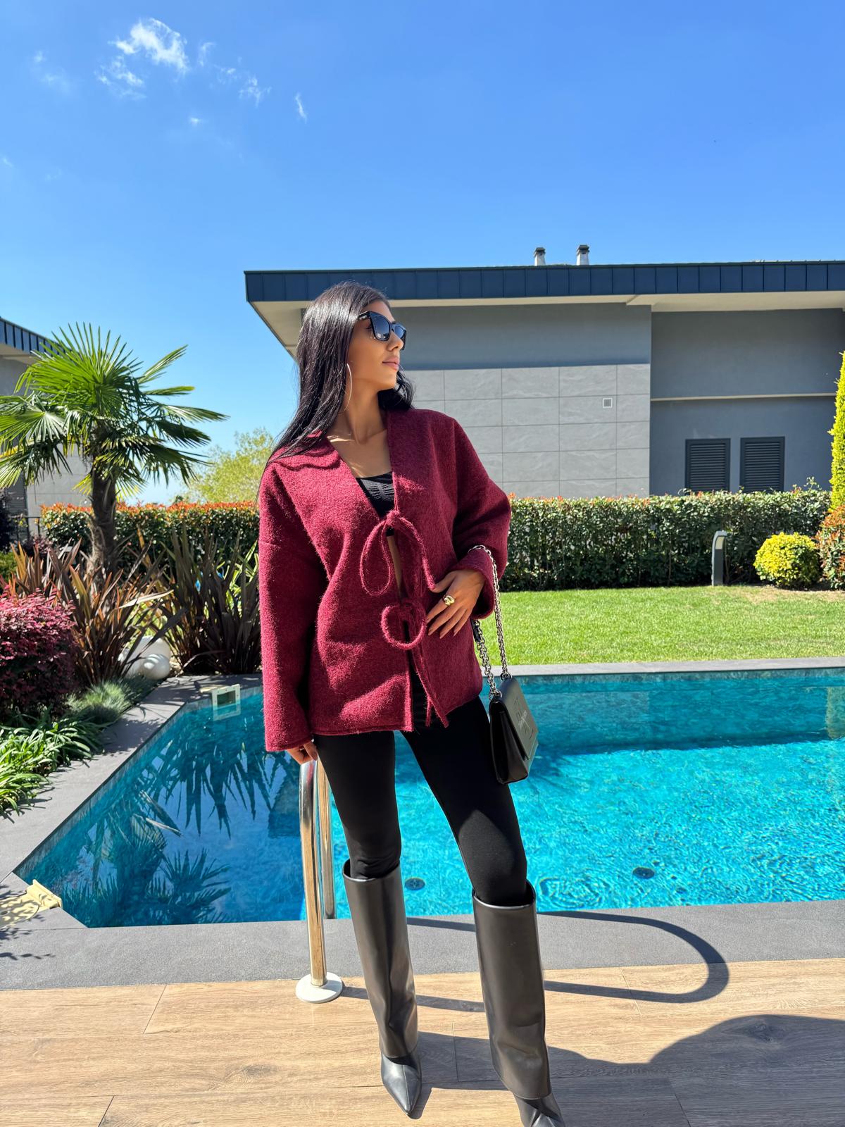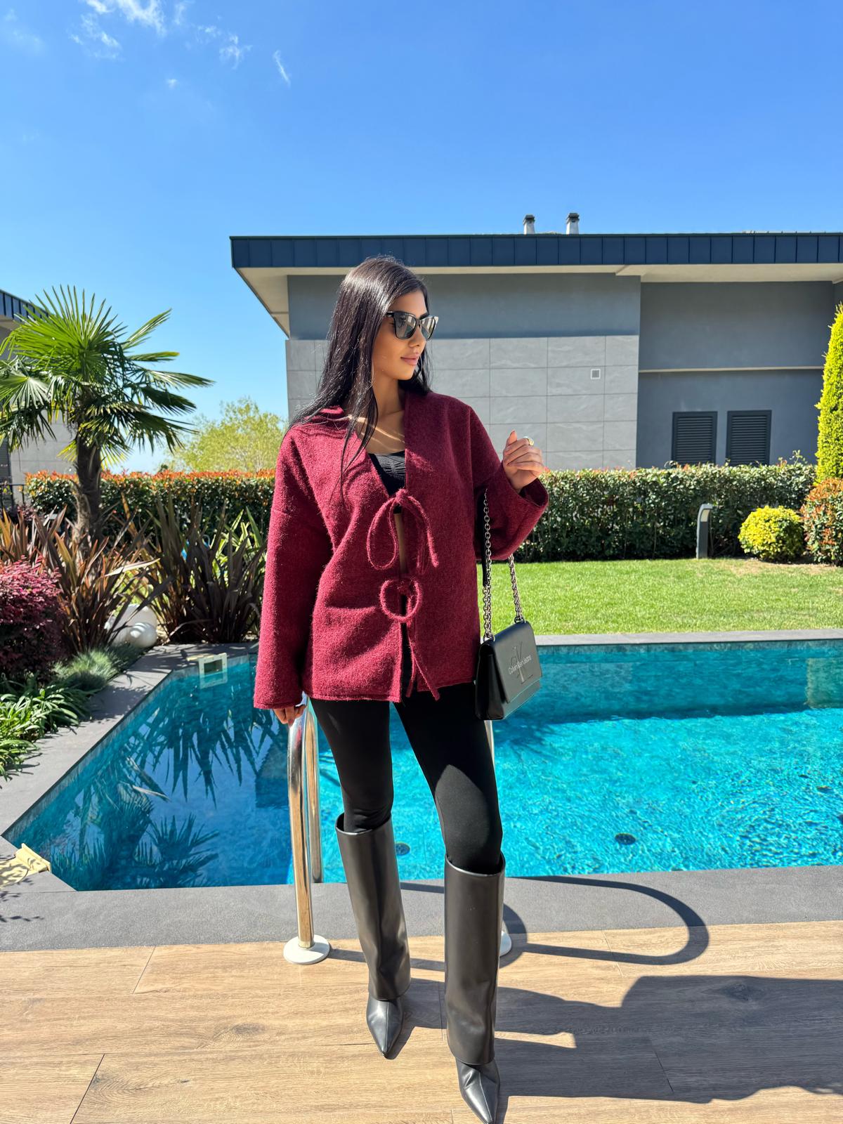 Önden Bağlamalı Kırçıllı Ceket Bordo
