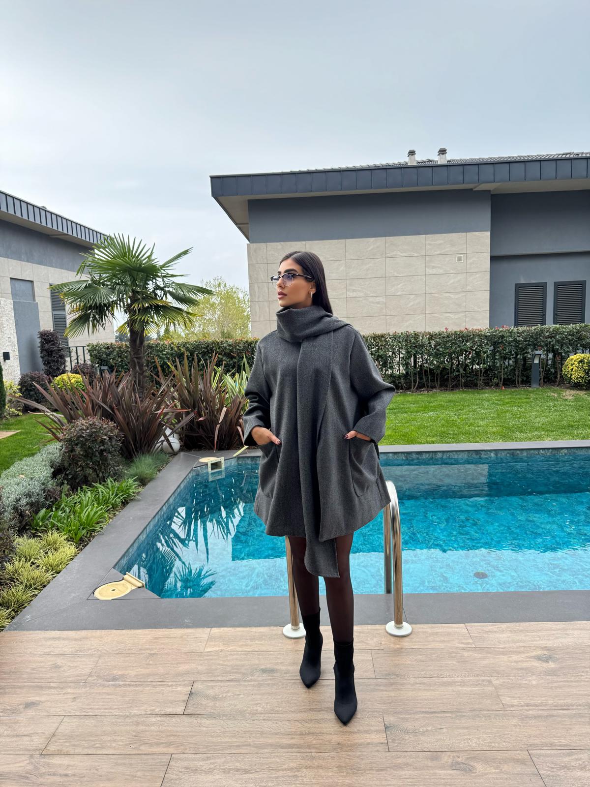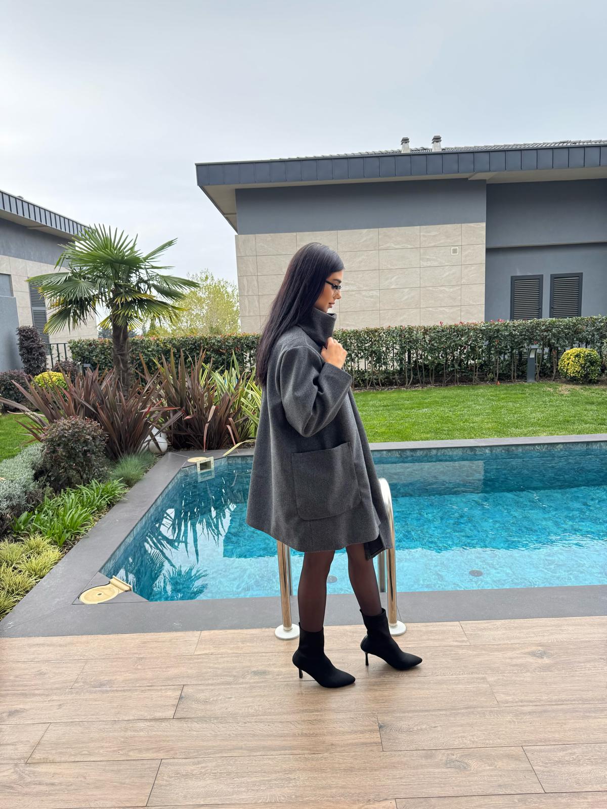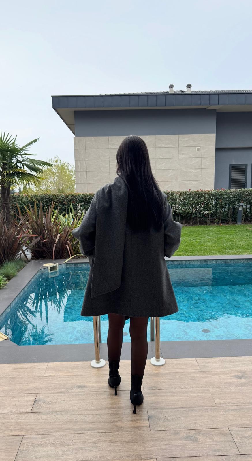 Şal Detaylı Premium Kalite Antrasit Kaşe Kaban