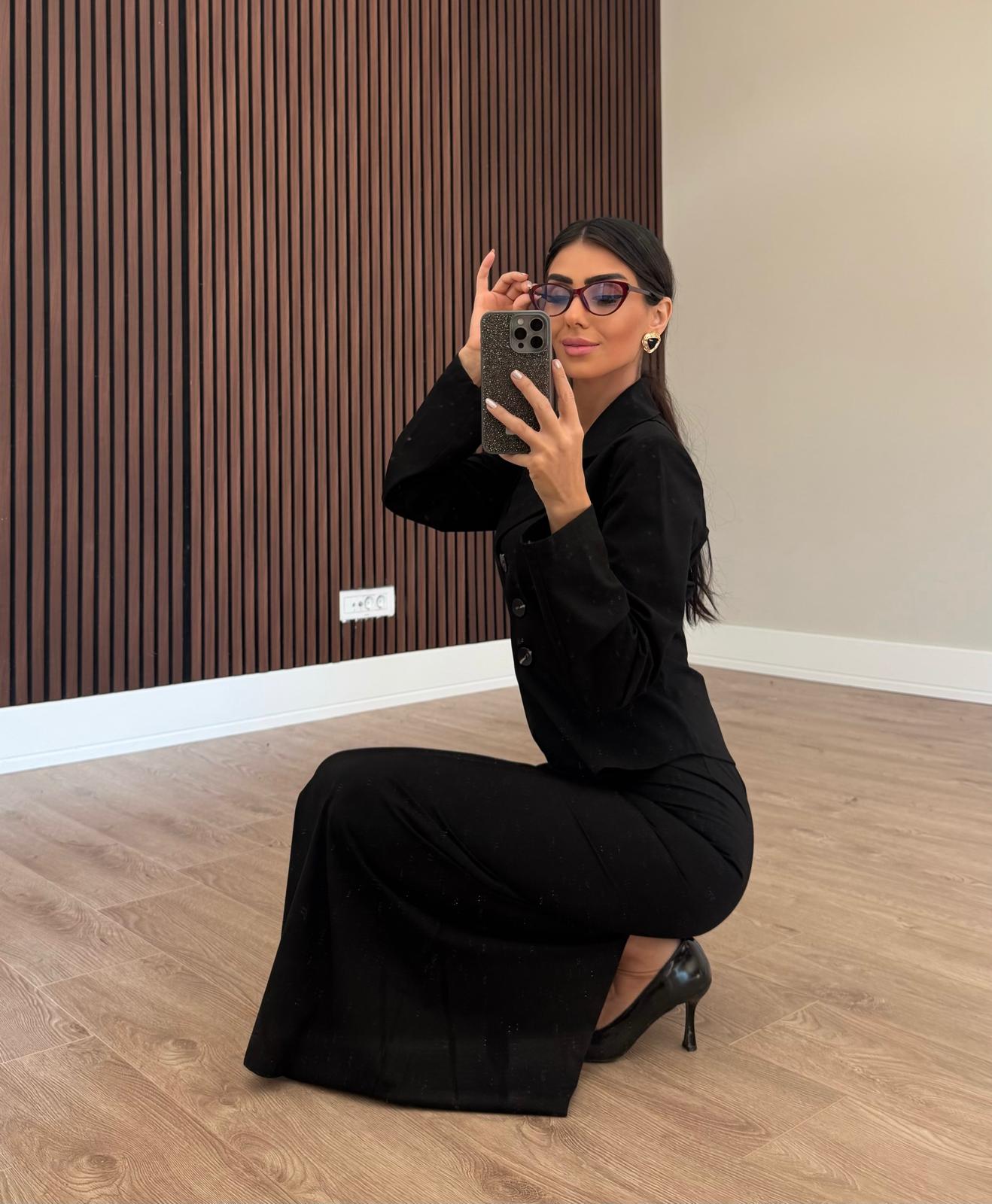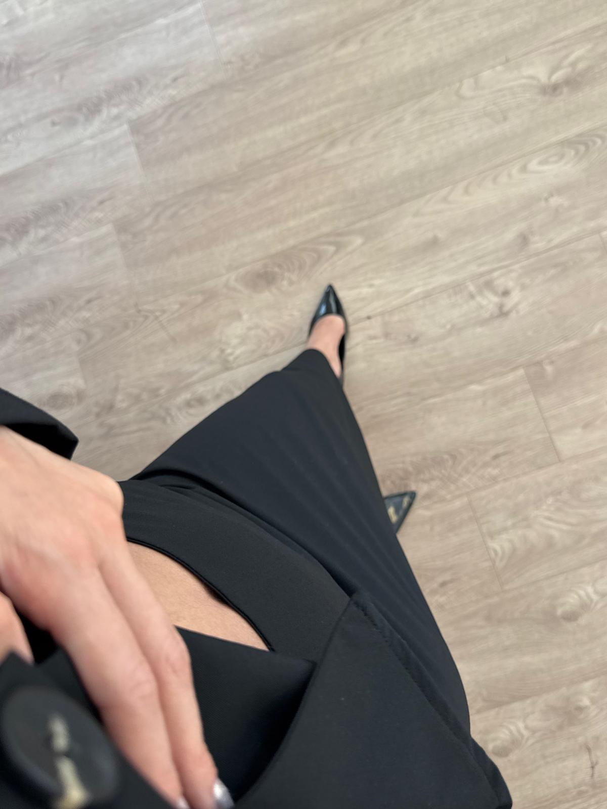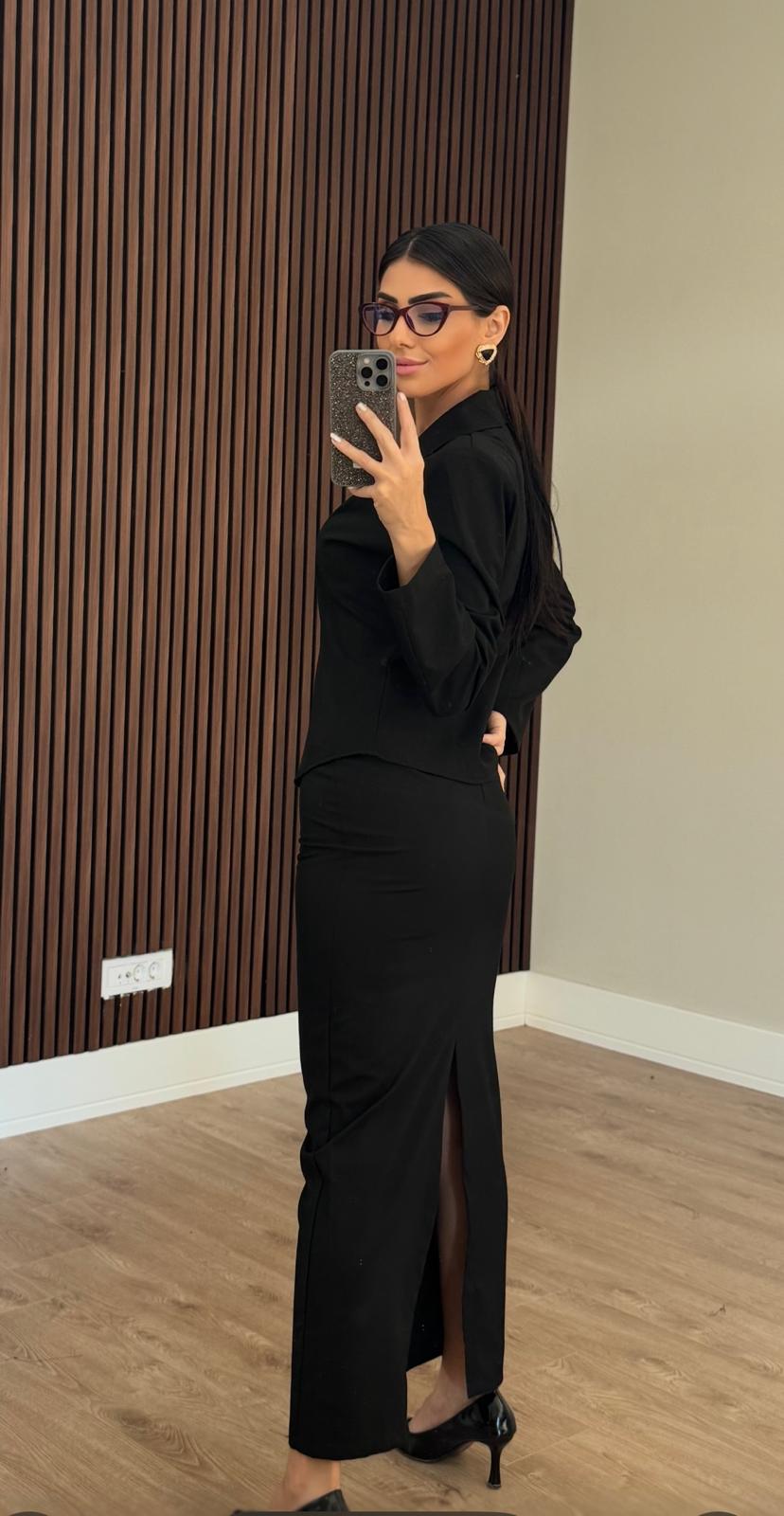Siyah Belden Oturtmalı İnce Ceket Etek Takım