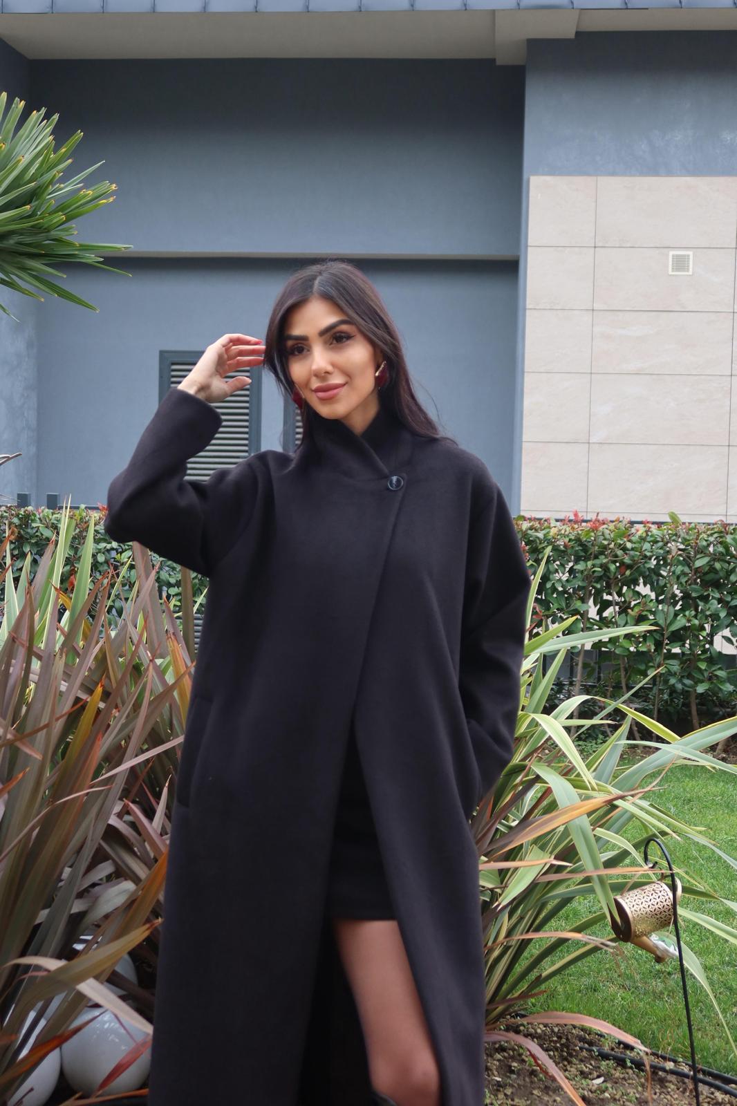 Siyah Dİk Yaka Tek Düğme Detaylı Kaban